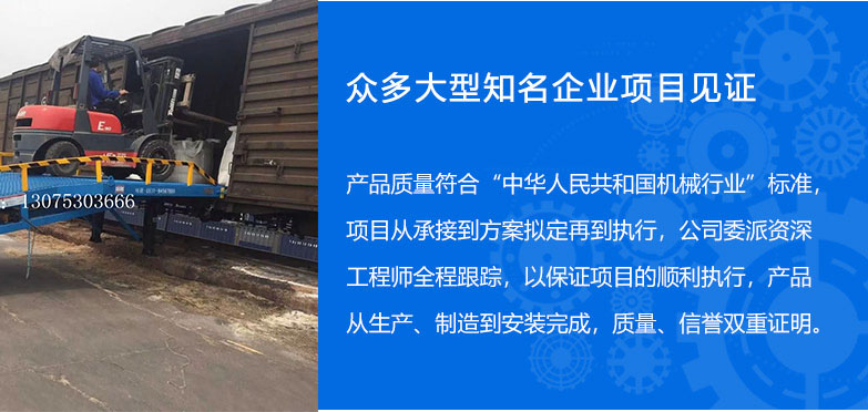 >> 13年的登車橋設(shè)備制造經(jīng)驗(yàn) 集設(shè)計(jì)、研發(fā)、生產(chǎn)和銷售于一體的制造型企業(yè),專業(yè)制造液壓登車橋,移動(dòng)式登 車橋和高空作業(yè)平臺(tái),經(jīng)驗(yàn)豐富,擁有強(qiáng)大的成產(chǎn)技術(shù)和完善的管理模式。 >> 引進(jìn)國(guó)際先進(jìn)施工工藝 配備整套專業(yè)自動(dòng)化生成設(shè)備,引進(jìn)國(guó)外先進(jìn)技術(shù), 定期培訓(xùn),確保設(shè)備的高品質(zhì)。 產(chǎn)品具有設(shè)計(jì)新穎、結(jié)構(gòu)合理、升降平穩(wěn)、載重安全、操作簡(jiǎn)單、維護(hù)方便等優(yōu)點(diǎn)。